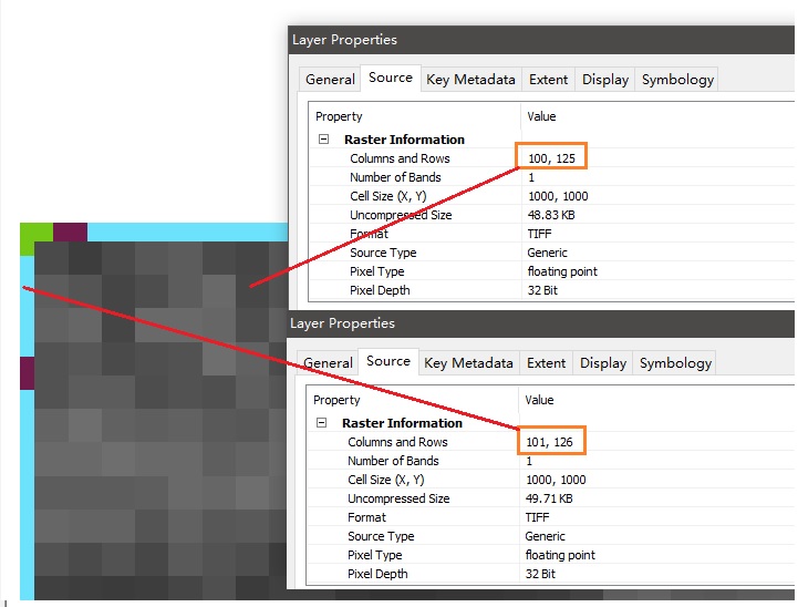 匹配前,基准栅格100 x 125,待匹配栅格101 x 126,像元数值与空间位置均不匹配。